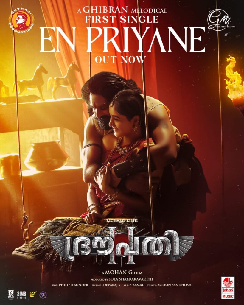 2020ൽ പുറത്തിറങ്ങിയ ദ്രൗപതി എന്ന ചിത്രത്തിന്റെ തുടർച്ചയായി സംവിധായകൻ മോഹൻ.ജി, യുവതാരം റിച്ചാർഡ് റിഷിയുമായി വീണ്ടും ഒന്നിക്കുന്ന ചിത്രത്തിൻ്റെ ആദ്യ ഗാനം റിലീസ് ആയി. ‘ദ്രൗപതി2’ എന്ന് പേരിട്ടിരിക്കുന്ന പാൻ ഇന്ത്യൻ ചിത്രത്തിനേ ഏറെ പ്രതീക്ഷയോടെയാണ് ആരാധകർ കാണുന്നത്. ആര്യൻ, അദ്ദേഴ്സ്, ജെ.എസ്.കെ, പാപനാശം, വിശ്വരൂപം2, രാക്ഷസൻ, വലിമൈ തുടങ്ങിയ ചിത്രങ്ങളിലൂടെ പ്രമുഖനായ ജിബ്രാൻ വൈബോധയാണ് ഈ പാൻ ഇന്ത്യൻ ചിത്രത്തിനും സംഗീതം നൽകിയിരിക്കുന്നത്. “എൻ പ്രിയനെ” എന്ന് തുടങ്ങുന്ന വരികളിലുള്ള ഗാനം സംഗീത സംവിധായകനൊപ്പം നമിത ബാബുവും ചേർന്നാണ് ആലപിച്ചിരിക്കുന്നത്. നേതാജി പ്രൊഡക്ഷൻസിൻ്റെ ബാനറിൽ സോള ചക്രവർത്തിയാണ് ചിത്രം നിർമ്മിച്ചിരിക്കുന്നത്.