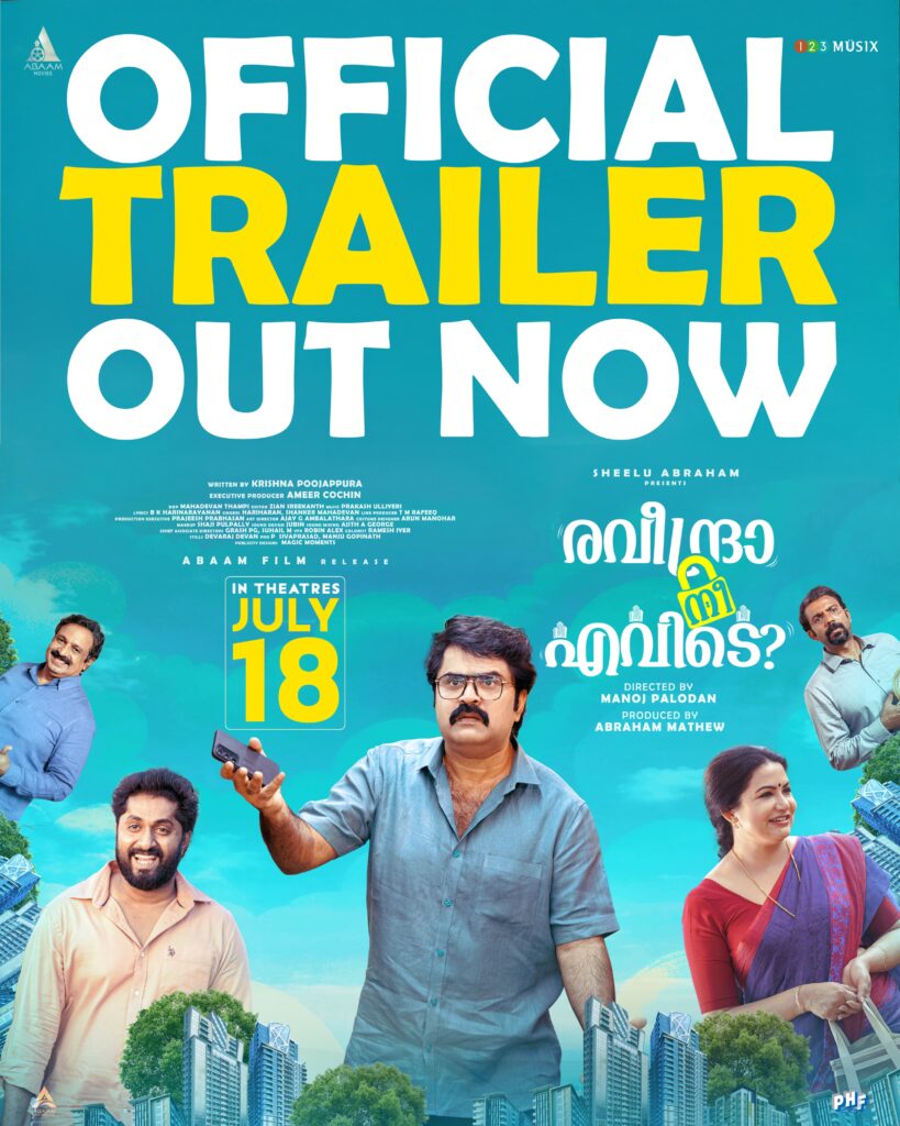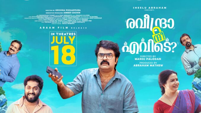 കാലാവസ്ഥ നിരീക്ഷണ കേന്ദ്രത്തിൻ്റെ പശ്ചാത്തലത്തിൽ അനൂപ്മേനോൻ, ധ്യാൻ ശ്രീനിവാസൻ, ഷീലു എബ്രഹാം എന്നിവരെ പ്രധാന കഥാപാത്രങ്ങളാക്കി എത്തുന്ന പുതിയ ചിത്രം ‘‘രവീന്ദ്രാ നീ എവിടെ??’’ ട്രെയിലർ എത്തി. ഭാര്യയെ പലപല കാരണങ്ങളാൽ സംശയിക്കുന്ന യുവാവിനെ ടീസറിൽ കാണാം. അതുമായി ബന്ധപ്പെട്ടുണ്ടാകുന്ന ചില പ്രശ്നങ്ങളും രസകരമായ നർമത്തിന്റെ മേമ്പൊടിയോടെ അവതരിപ്പിക്കുന്ന സിനിമയാകും ‘രവീന്ദ്രാ നീ എവിടെ?’. തീർത്തും ഹ്യൂമറിന് പ്രാധാന്യം നൽകി എത്തുന്ന ചിത്രം മനോജ് പാലോടൻ സംവിധാനം ചെയ്ത്, അബാം മൂവീസിൻ്റെ ബാനറിൽ ഷീലു എബ്രഹാം അവതരിപ്പിച്ച് എബ്രഹാം മാത്യു നിർമ്മിക്കുന്നു. ഹാസ്യത്തിനൊപ്പം കുടുംബ പ്രേക്ഷകർക്കും ഒരുപോലെ രസിക്കുന്ന ചിത്രം ഏറെ നാളുകൾക്ക് ശേഷം കൃഷ്ണ പൂജപ്പുരയുടെ തിരക്കഥയിൽ എത്തുന്നെന്ന പ്രത്യേകതയും ഉണ്ട്. ബി.കെ ഹരി നാരായണൻ്റെ വരികൾക്ക് സംഗീതം ഒരുക്കിയിരിക്കുന്നത് കേരള സംഗീത നാടക അക്കാഡമി അവാർഡ് ജേതാവ്കൂടിയായ പ്രകാശ് ഉള്ളേരിയാണ്. ഹരിഹരൻ, ശങ്കർ മഹാദേവൻ എന്നിവരാണ് ചിത്രത്തിൽ പാടിയിരിക്കുന്നത്.